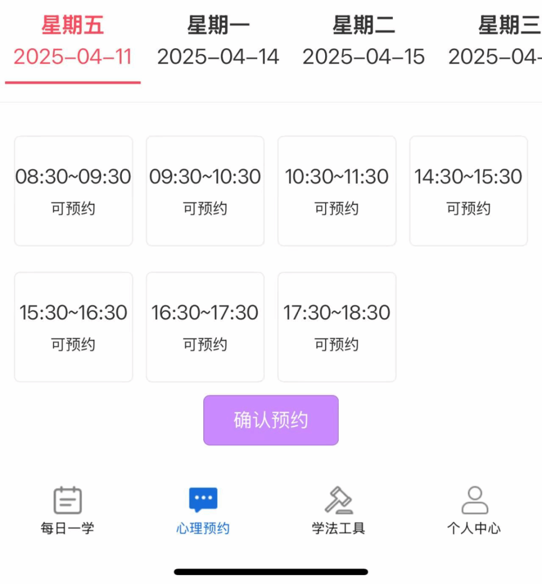 预约只能从当前时间起到第5天,选择适合自己的咨询时间和咨询老师,填写完线上表格点击提交即可。