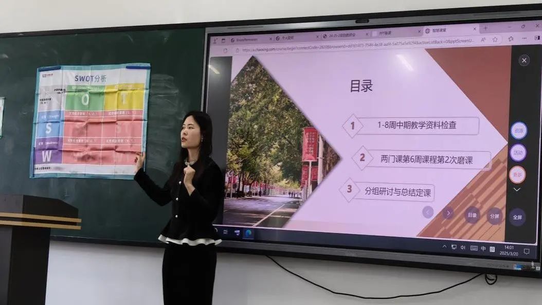 基于上周四第三次磨课成果,本次磨课旨在从课程思政、课程重点、教学工具、教学方法、教学时间安排等方面,精磨第6教学周课程内容,确保课堂节奏紧凑且高效。杨茜、安婧华两位老师分别对《大学生职业生涯发展与规划》、《大学生就业指导》两门课程内容进行了精讲。