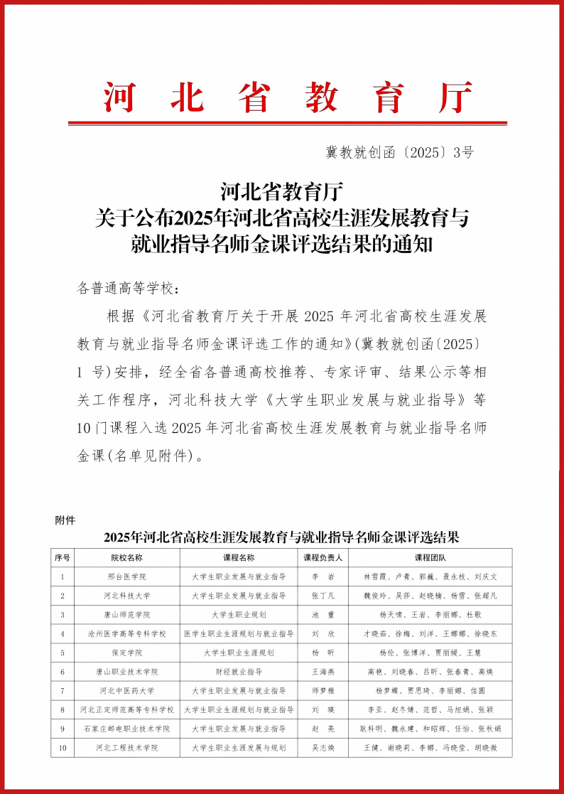 7月1日,河北省教育厅公布2025年河北省高校生涯发展教育与就业指导名师金课评选结果,我校组织申报的《大学生职业生涯发展与规划》课程被评为省级高校生涯发展教育与就业指导名师金课。